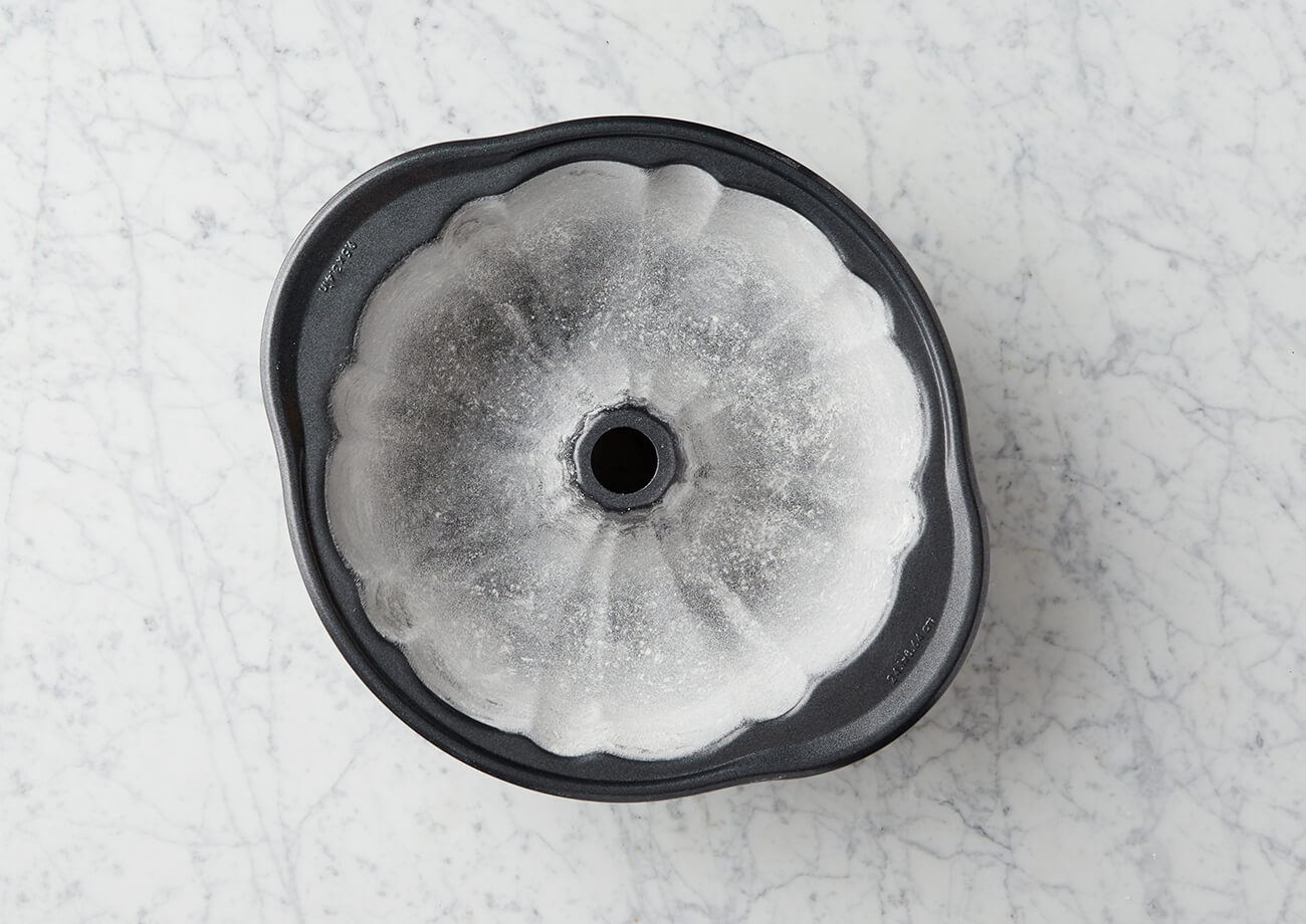 Rub a tablespoon or less of butter on the inside of a baking pan until it is completely coated; don't miss corners and edges. Add a few tablespoons of all-purpose flour. Tip and tilt the pan with one hand and tap with the other to make sure flour dusts all surfaces, then dump out excess.