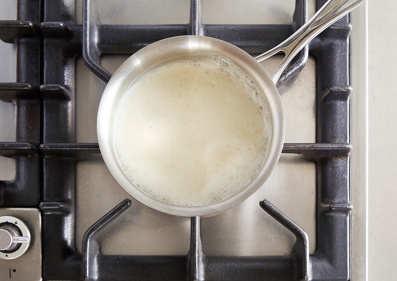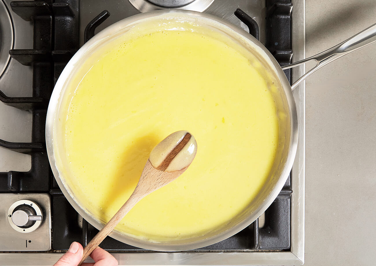 When a thin, even film covers the back of a wooden spoon after it has been dipped into a cooked mixture. If a finger is dragged on the spoon and the mixture does not come back together, it’s done cooking.