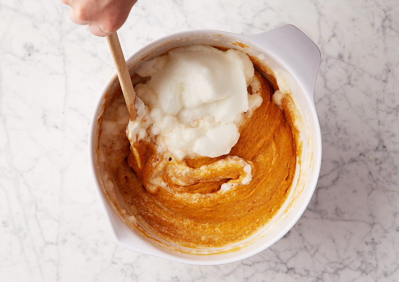 To combine two substances gently in an effort to maintain a fluffy texture. (Whipped cream or egg whites, for instance, will deflate if stirred.) Using a spatula, cut down through the center of the two mixtures and slowly bring the bottom, heavier mixture back up to the top; think of it as a "down-across-up-and-over motion." This should be done a few times in order to fully incorporate both mixtures.