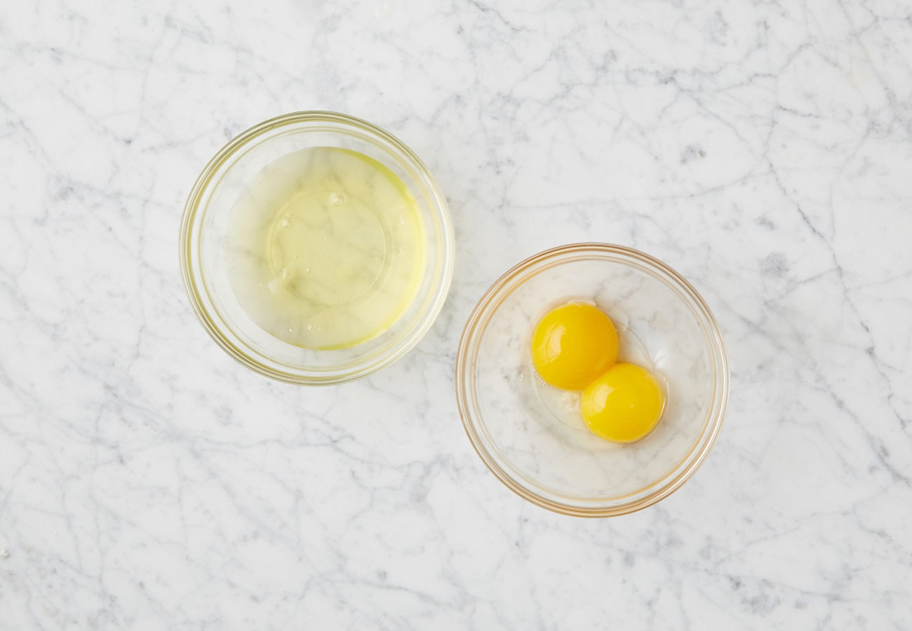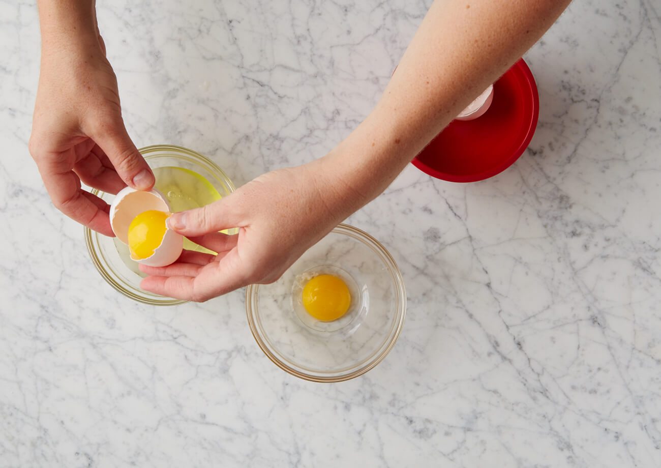 Break the egg in half into a clean hand over a bowl. Hold your fingers a little bit apart and let the white slip through, leaving the yolk in your hand. Place yolk in another bowl.